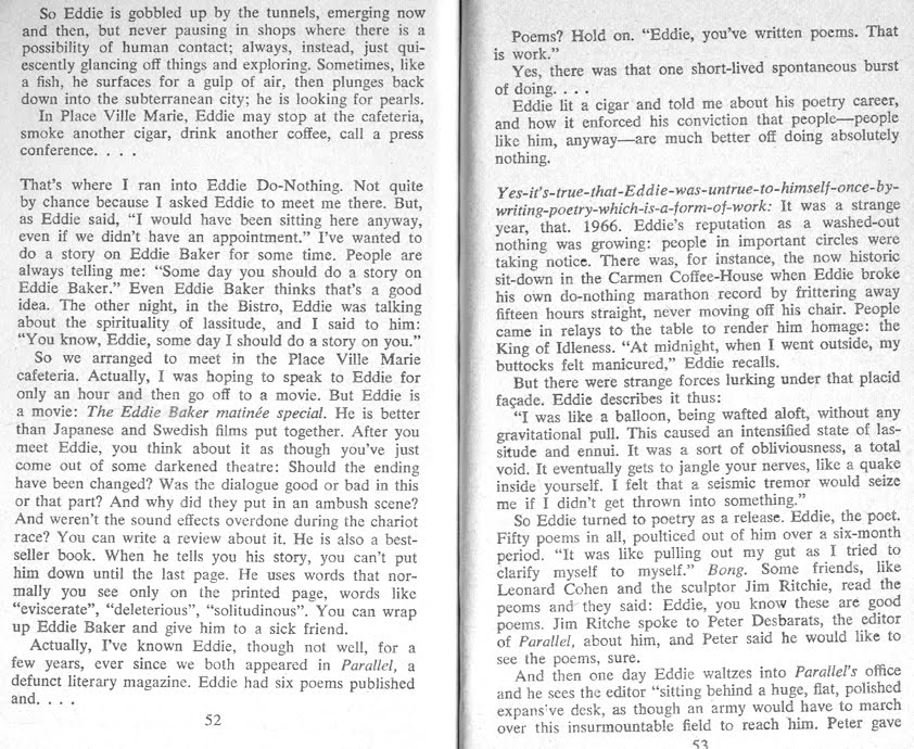 In around 1969 Baker became an underground literary-and-lifestyle Montreal icon as a 41-year-old who'd wander around and do nothing all day, thanks to a stipend from his Massachusetts-based father, who ran a women's apparel business.